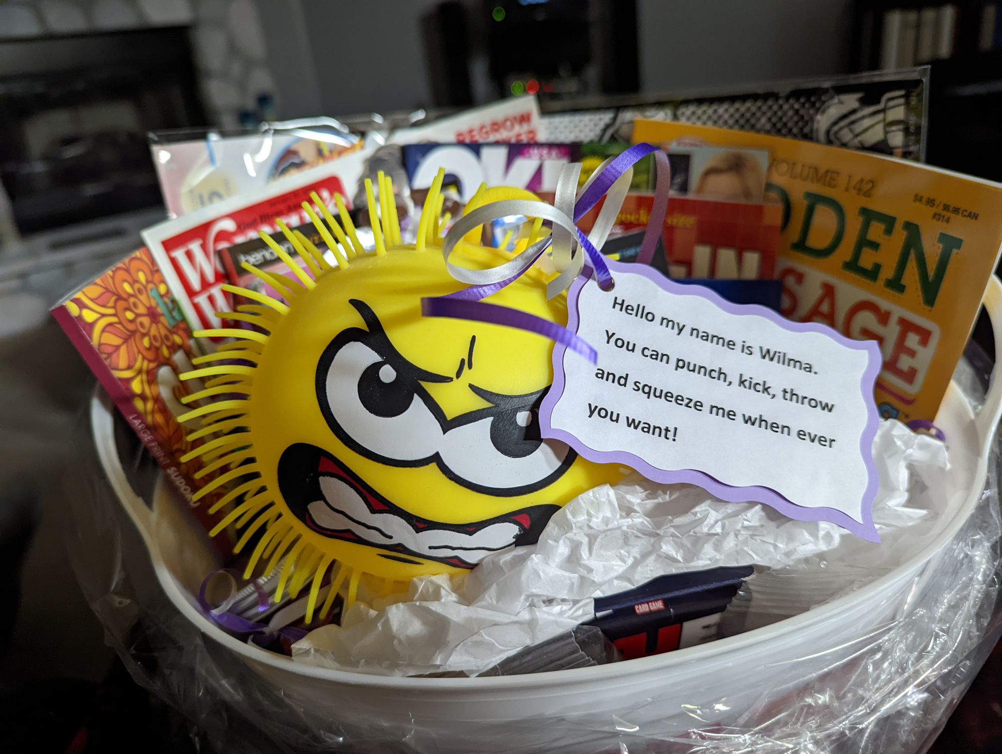 Marcus and Rocki came with a basket of goodies that I can use to tackle my boredom when I'm down (thanks Jordan for helping with the presentation - it was awesome!) Enter Wilma: my own personal a*#hole. Glad I have permission to abuse her whenever I want! She's going to take a beating! LOL